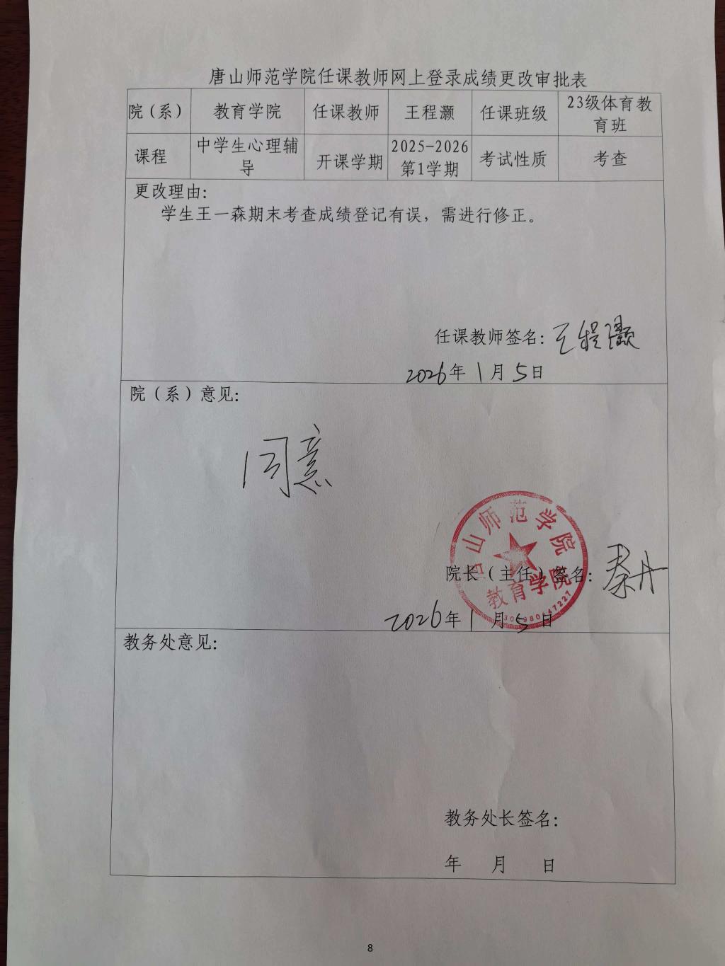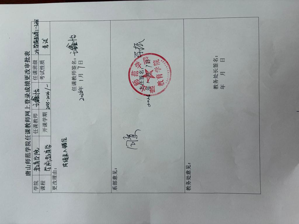 唐山师范学院任课教师网上登录成绩更改审批表