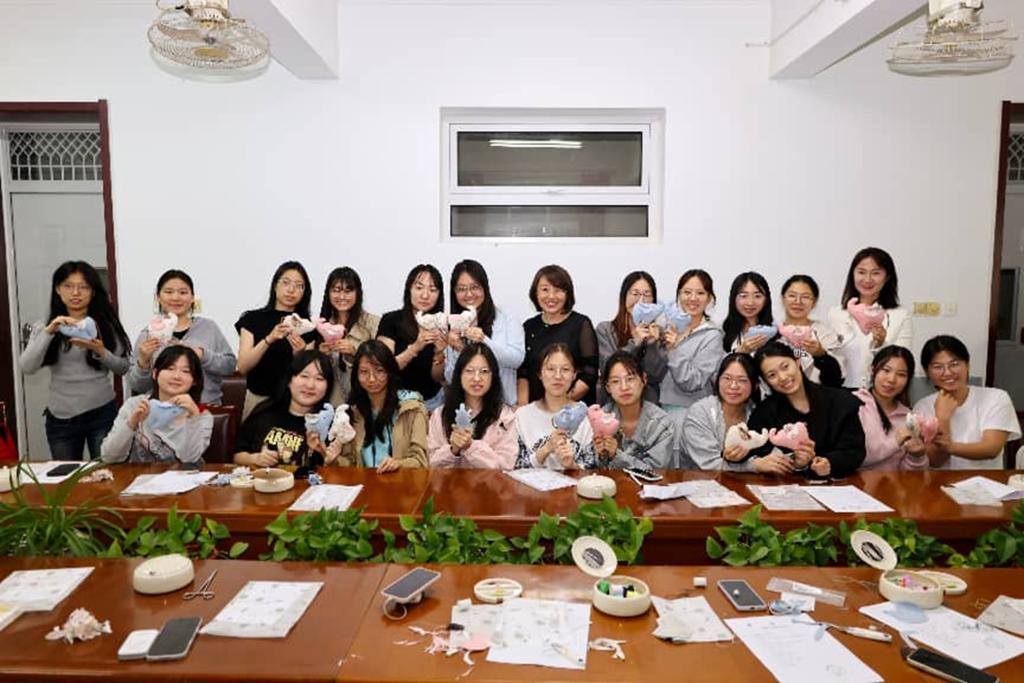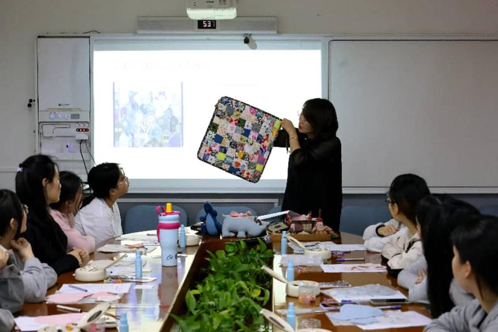 在实践教学环节,王玉老师以“变废为宝”与“主题创意”为主线,现场演示了无缝纫有关的多项手工技巧。她将复杂步骤拆解为通俗易懂的环节,手把手指导同学们进行操作。从简单的缝纫造型到富有故事情境的主题创作,同学们兴致高昂,纷纷拿起剪刀、针线和布料,跟随老师的节奏动手实践。课堂上,师生互动频繁,气氛热烈而专注。王老师还针对同学们在制作过程中遇到的难点逐一解答,并鼓励大家大胆创新,打破思维定式。