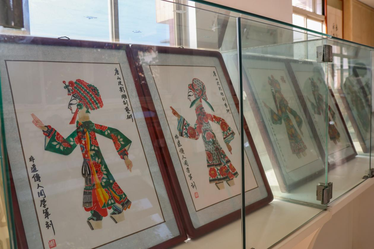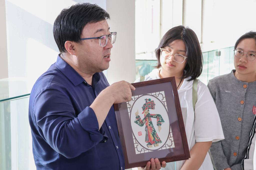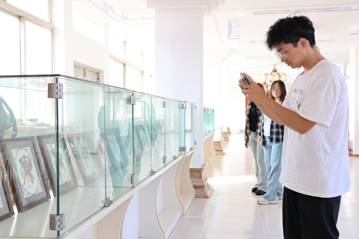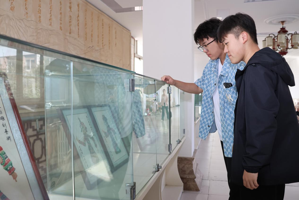 随后,在教育学院党委书记贾长胜与周馆长的领下,师生们移步连廊近距离参观了皮影展品。周馆长逐一对展品的题材来源艺术风格及文化寓意进行解读。从经典剧目角色到现代创新设计,每一件皮影作品都成了鲜活的文化教材,让师生在近距离观赏中深化了对非遗艺术的认知。